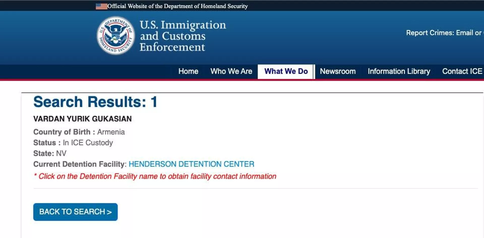 Как узнало издание Hetq, Гукасян находится в Лас-Вегасе, однако не в казино, а в изоляторе Henderson detention center. Его нашли по поисковику Службы иммиграции и таможенного контроля (ICE).